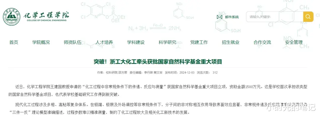 大项目:2024年12月,浙工大化学工程学院的王建国教授,申请的“化工过程中非常规条件下的传递、反应与测量”项目,成功获批国家自然科学基金重大项目,资助金额高达1500万元。这是学校首次拿下这个级别的项目,它的基础研究实力已经进入了新的阶段。