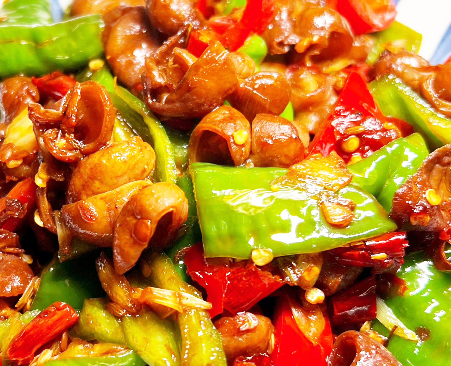 最终成菜时,肥肠应焦香四溢,青红辣椒点缀其中,看着就让人食欲大开。