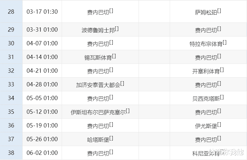 当然了,费内巴切的赛程也不轻松,后面他们也要遇到萨姆松珀、贝西克塔斯和伊尤斯堡等对手,好在这些比赛,费内巴切都是主场作战。要是后面的比赛,费内巴切能全胜,相信他们有很大机会逆转夺冠。不过要11场联赛全胜,难度非常之大,接下来就看穆帅能否率队创造奇迹了!