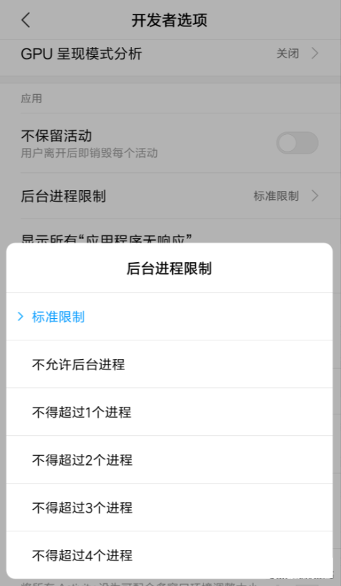 以小米手机为例:打开设置-开发者选项(进入开发者选项先找到手机的所有参数,连点miui版本4次)-应用-后台进程限制。 然后根据你的手机情况限制后台。