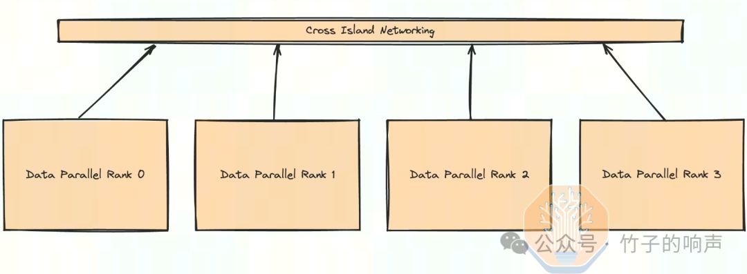 由于数据并行相对的通信量比较少,因此,可以跑在不同 计算岛之间: