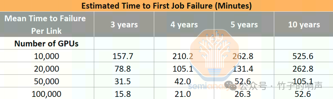 在网络故障领域,Infiniband/RoCE链路故障是最常见的问题。尽管收发器数量较多,但在全新且正常运行的集群中,第一次作业故障仅需26.28分钟,即使每个网卡到最底层交换机链路的平均故障率为5年。