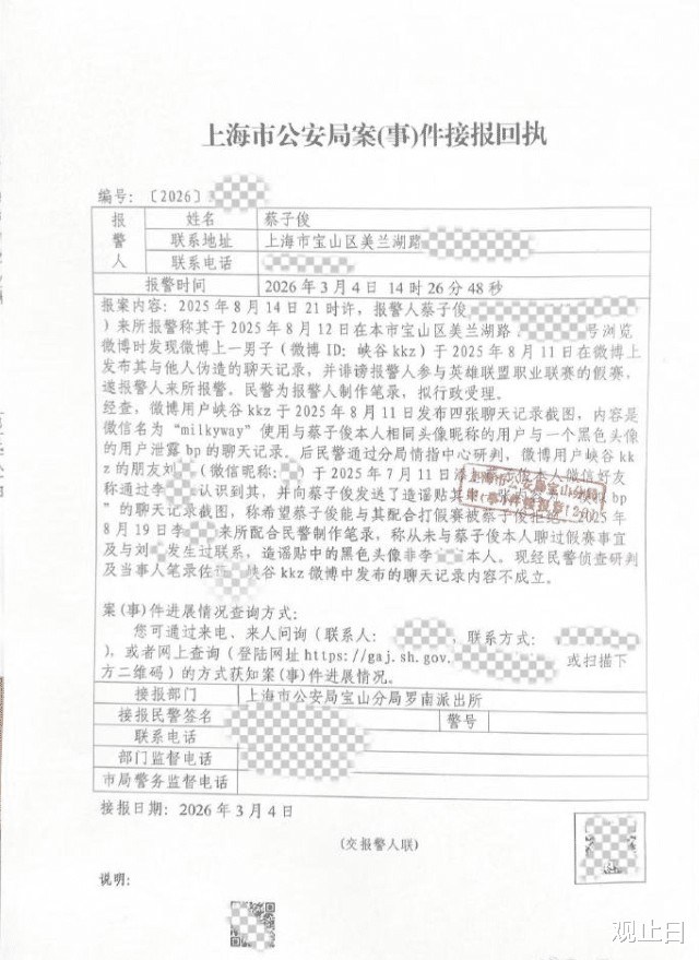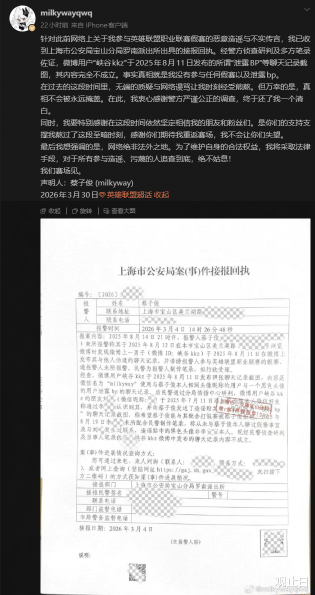 2026年3月30日:Milkyway再次发声。这一次,他拿出了足以让所有人闭嘴的“实锤”——上海警方的接报回执。他在声明中写道:“经警方侦查研判及多方笔录佐证,微博用户‘峡谷kkz’于2025年8月11日发布的所谓‘泄露BP’等聊天记录截图,其内容完全不成立。事实真相就是我没有参与任何假赛以及泄露bp。”