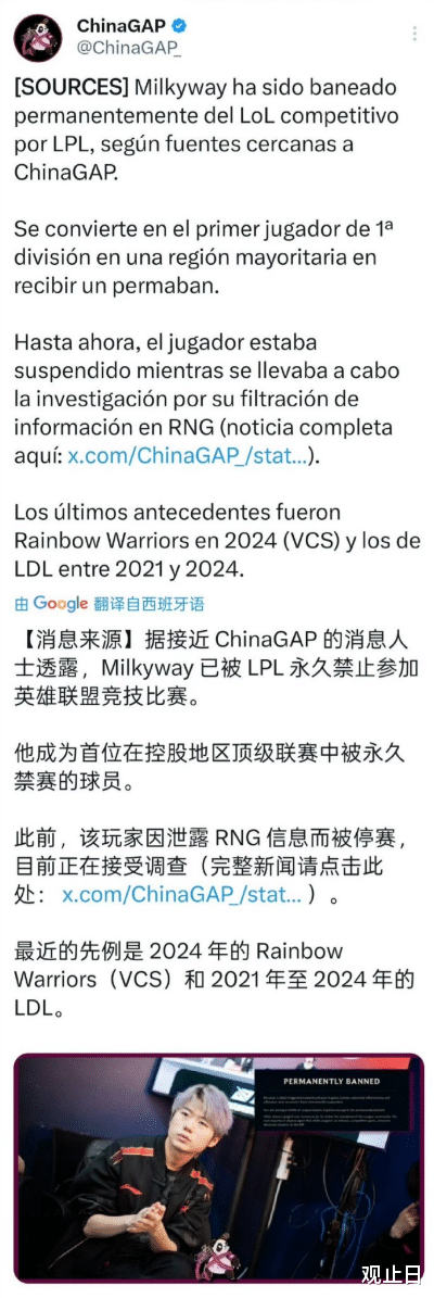 2025年底:就在舆论逐渐平息之际,外媒ChinaGAP突然抛出惊天爆料,称Milkyway已被LPL赛区永久禁止参加《英雄联盟》电竞比赛,他也成为了“首位在主流赛区顶级联赛中被永久禁赛的选手”。这个消息让刚刚看到一丝希望的粉丝和选手本人再次跌入深渊。