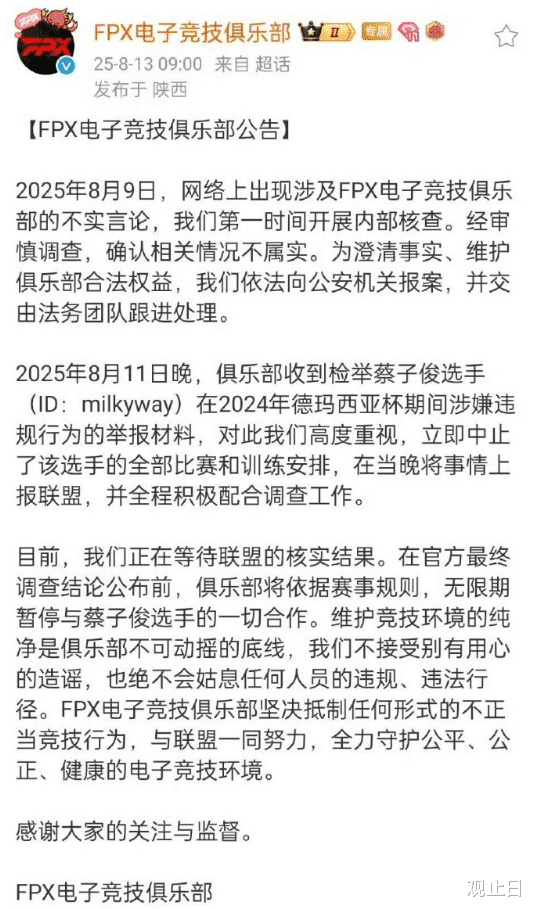 2025年8月13日:FPX俱乐部火速发布官方公告,表示高度重视该举报材料,立即中止了Milkyway的全部比赛和训练安排,并上报联盟全力配合调查。职业生涯刚刚起步的银河,被摁下了暂停键。