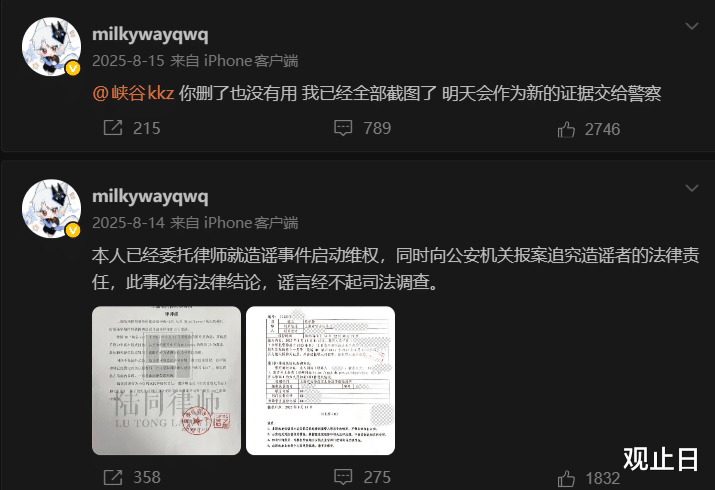 2025年8月15日:Milkyway在个人社交账号发文,郑重否认所有指控,声称聊天记录均为伪造,并已委托律师就造谣事件维权,同时向公安机关报案。他说:“此事必有法律结论,谣言经不起司法调查。”