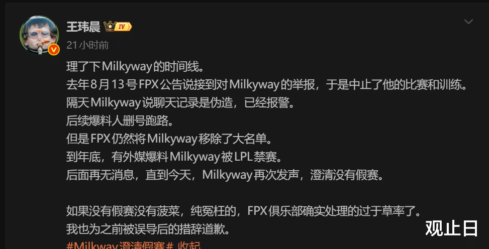 与此同时,媒体人王玮晨也为当初被误导后的措辞公开向Milkyway道歉,并直言:“如果没有假赛没有菠菜,纯冤枉的,FPX俱乐部确实处理的过于草率了。”
