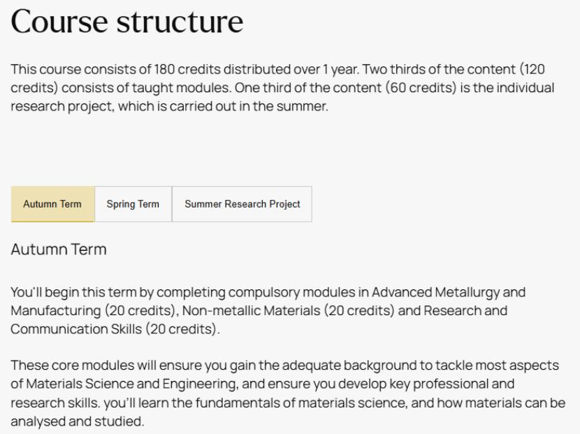 材料科学与工程硕士课程共计180学分,为期一年。其中120学分为授课模块,60学分为夏季开展的个人研究项目。具体开设的课程为: