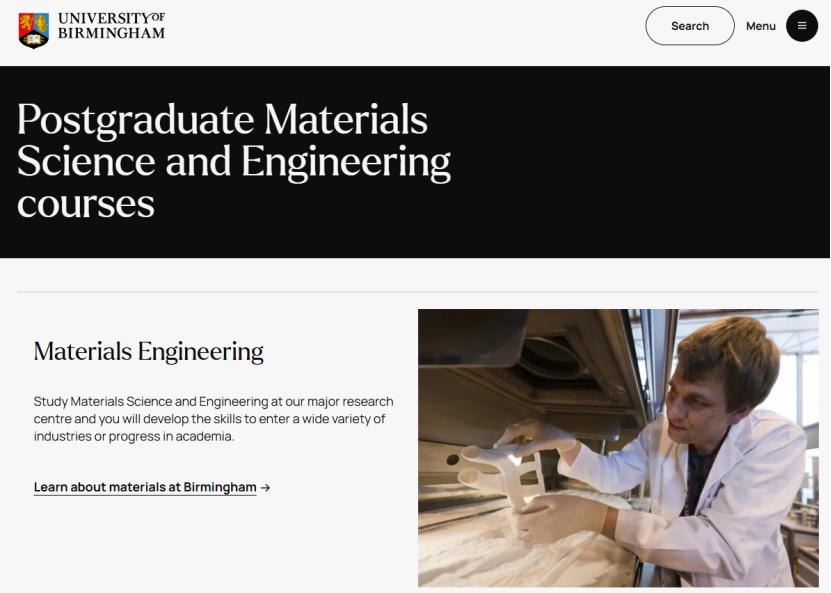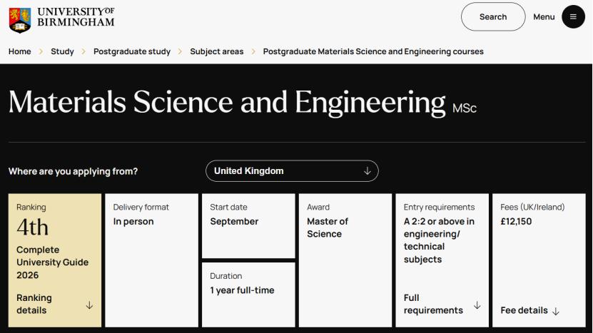 在2026年《完全大学指南》中,伯明翰大学的材料技术专业排名英国第4位。材料科学与工程硕士能使用英国顶尖的材料研究中心之一,为深造研究生学习提供绝佳准备。就读该硕士的学生,将受益于由领域内全球专家教授的课程。教学计划包括讲座、实践与案例研究、小组、以及个人研究项目。