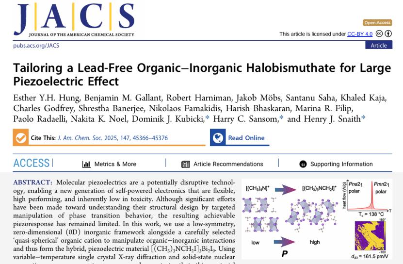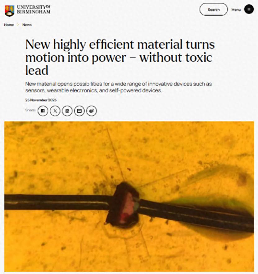 研究成员伯明翰大学的Dominik Kubicki博士表示,这种材料采用无毒的铋元素制成,性能却可与商业压电材料相媲美。这一发现为未来可驱动传感器、医疗植入体和柔性电子设备的环保技术开辟了新路径。