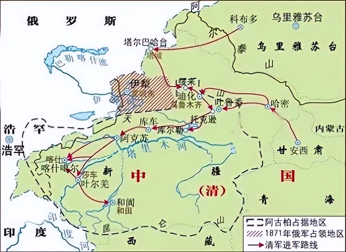 1871年,沙俄趁着阿古柏向北疆进犯之际,不顾我国主权,一举侵占了我国伊犁地区,还假称“无久占之意”,实则是眼红阿古柏,也为了防止阿古柏进一步扩大势力。