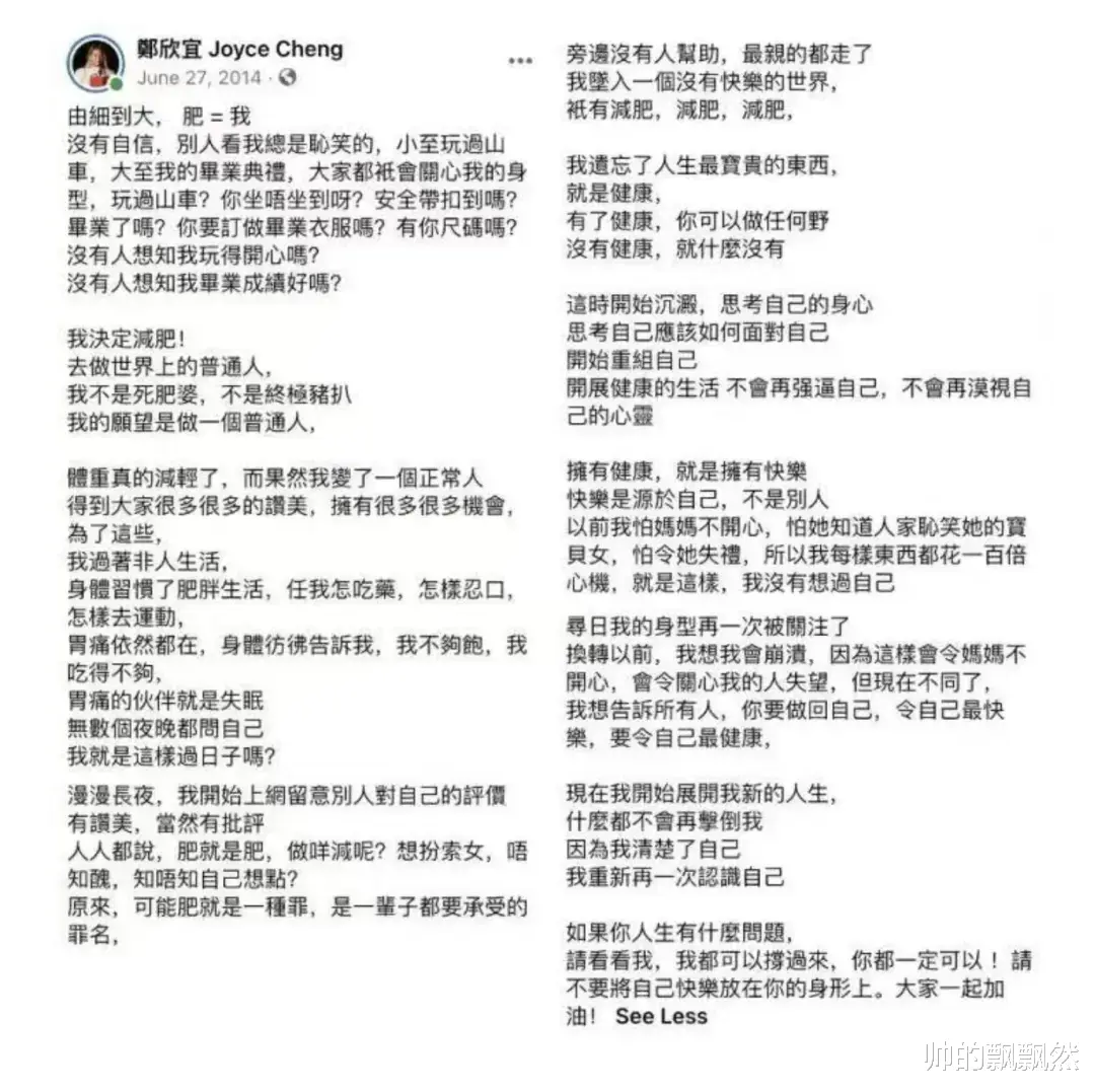 对于郑欣宜的再次肥胖,港媒又开始了铺天盖地的对她进行嘲讽。面对这些舆论和非议,这让郑欣宜很是不自信,甚至让她一度将自己紧绷。
