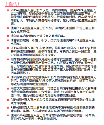 “RSPA遥控直入直出泊车仅是一项辅助功能,使用RSPA遥控直入直出泊车前,您务必确保在视野范围内使用该功能遥控车辆,严禁使用该功能代替您对交通状况进行观察和判断。若车辆行进方向有行人、车辆闯入或者有障碍物时,应及时松开前进或后退按钮。”