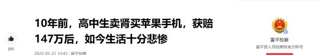 ( 信息来源:富平检察 2022年05月21日 —— 10年前,高中生卖肾买苹果手机,获赔147万后,如今生活十分悲惨 )