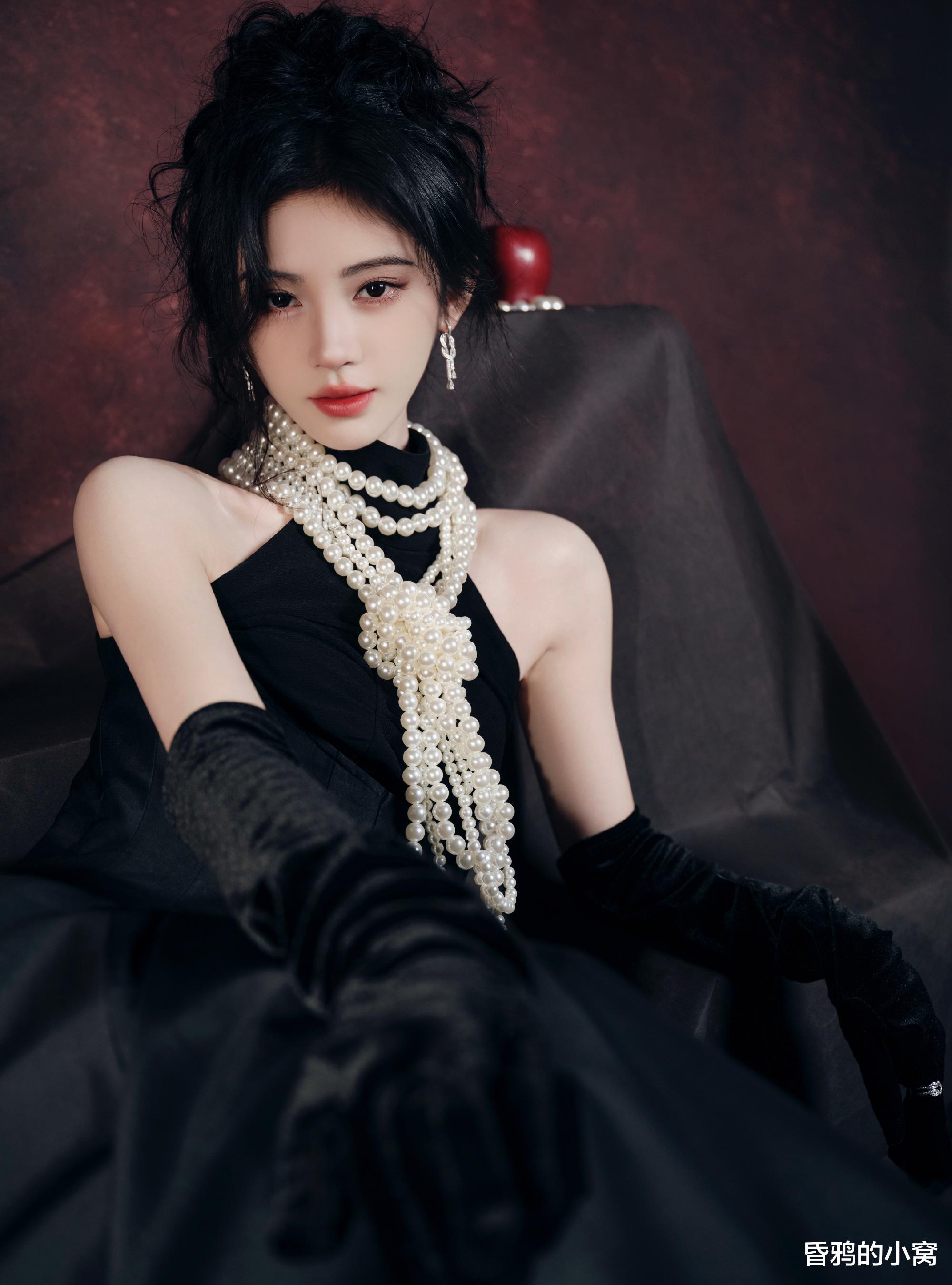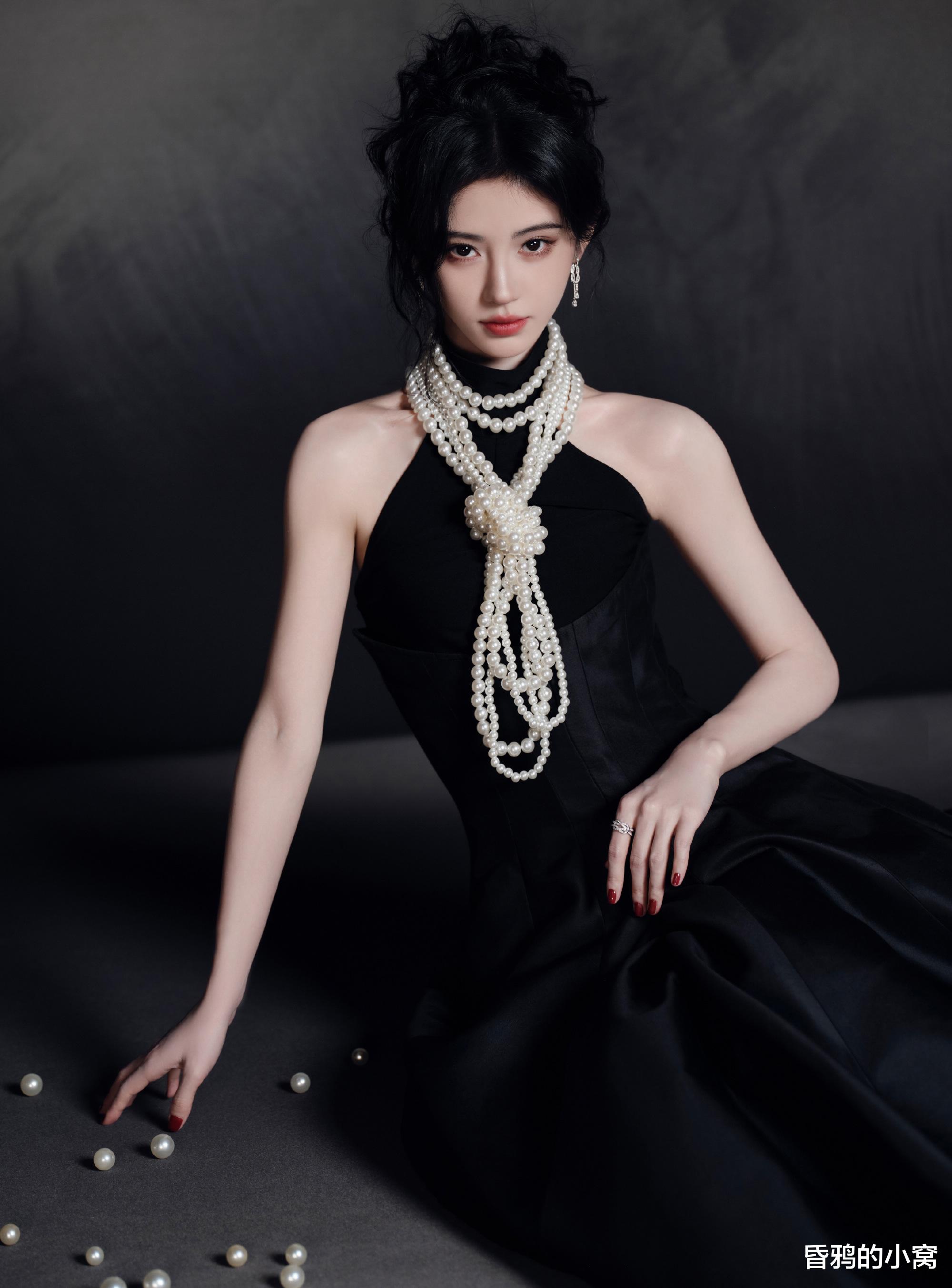 鞠婧祎身着黑色丝绒长裙,搭配同色丝绒手套。多层珍珠从锁骨延伸至胸前,尽显“现代赫本风”的优雅韵味,被形容为黑天鹅公主”。