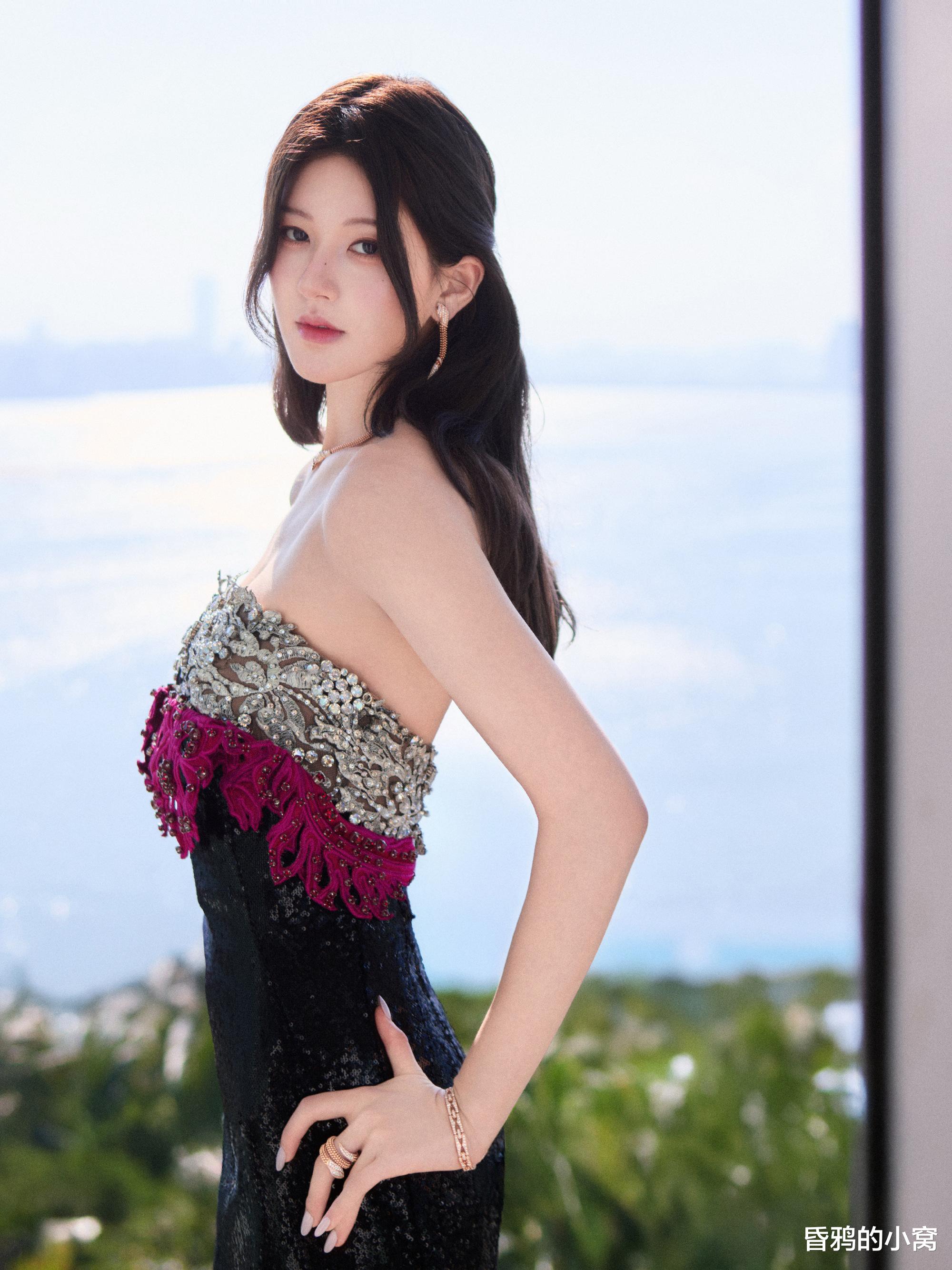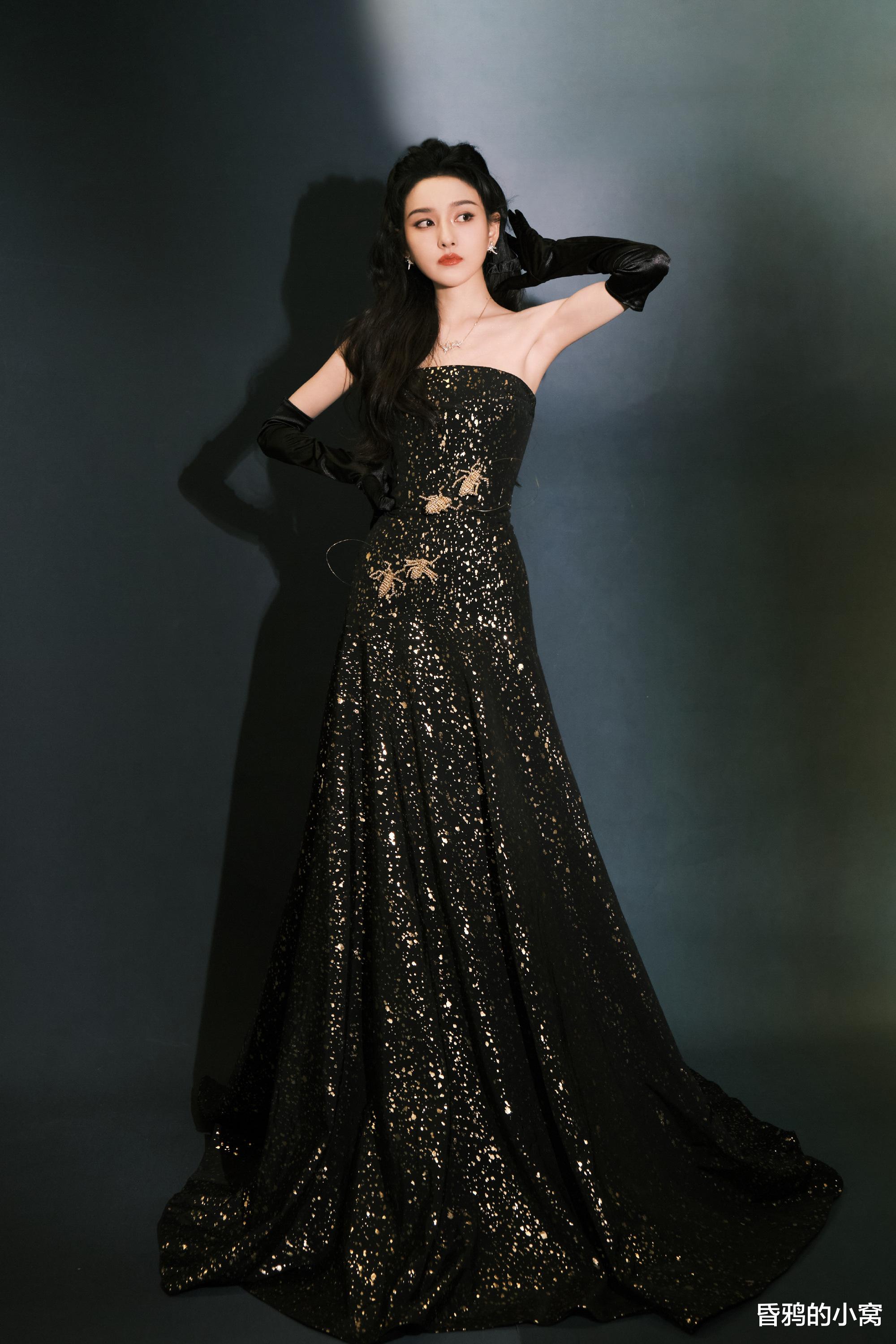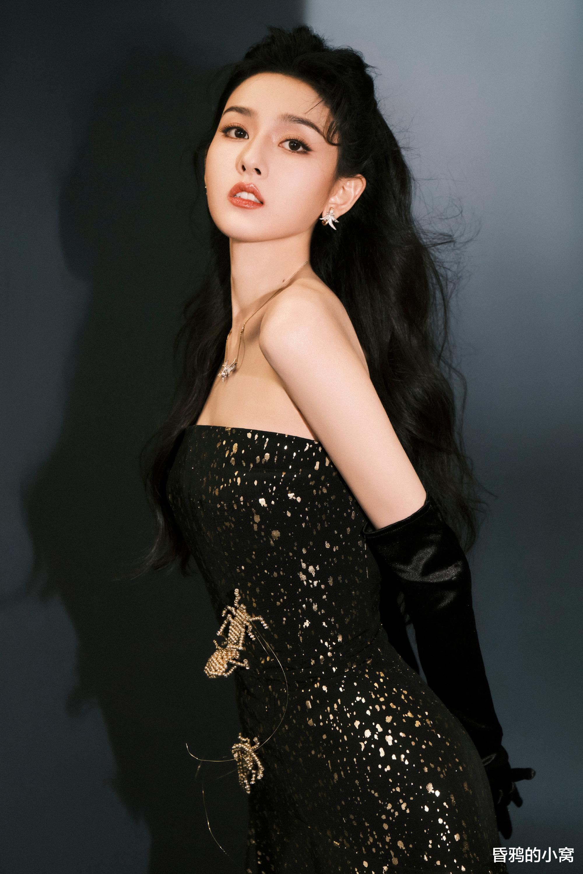 白鹿身穿波点亮片抹胸裙,细碎的银白在黑底上溅开,像浪尖抖落的星子,又像揉碎的月光落了满身。抹胸处的黑色褶皱是恰到好处的柔,裹着肩颈的线条,高开叉裙摆随着站姿轻垂,长发被风掠起几缕,冷艳里掺着漫不经心的松弛,揉成了独一份的张力。