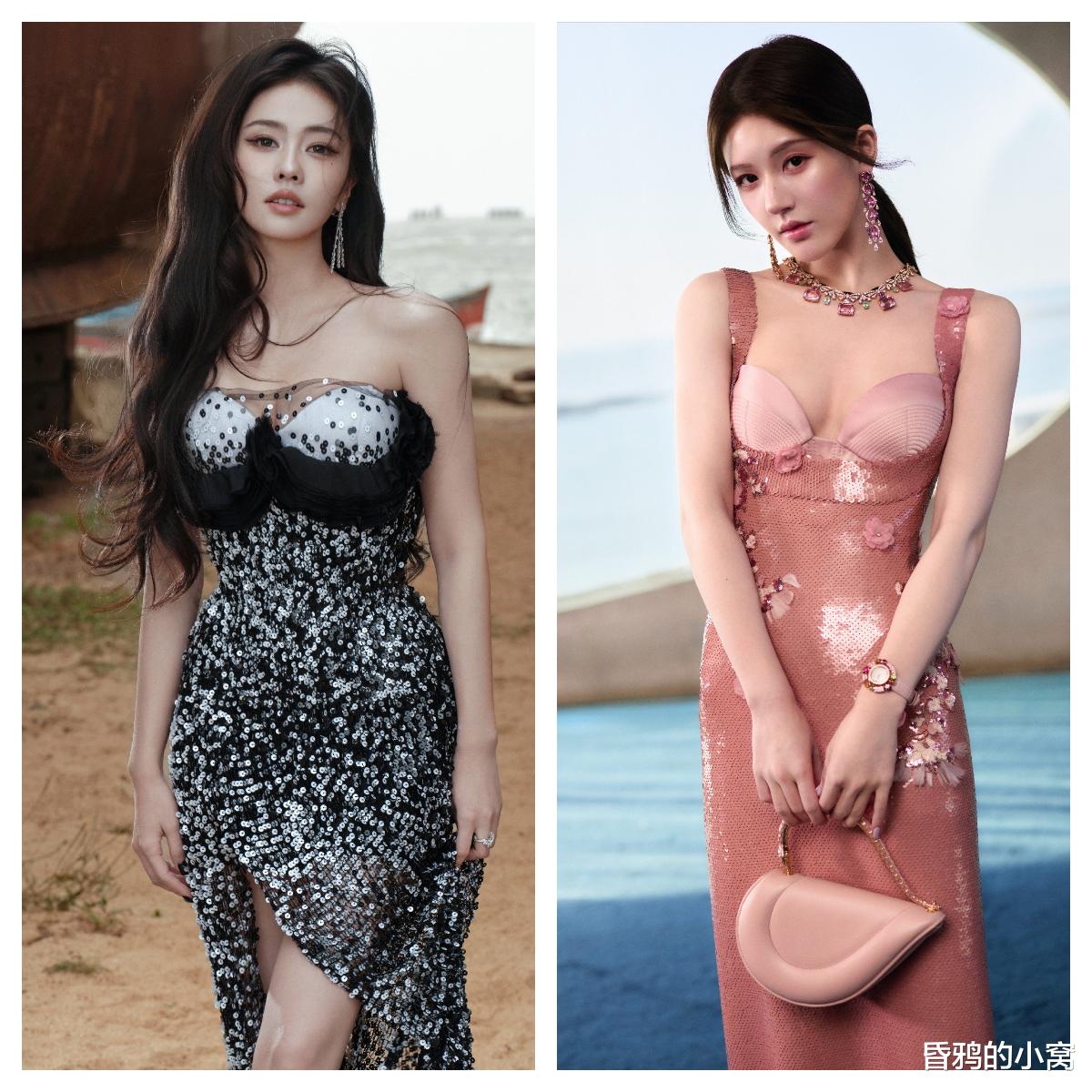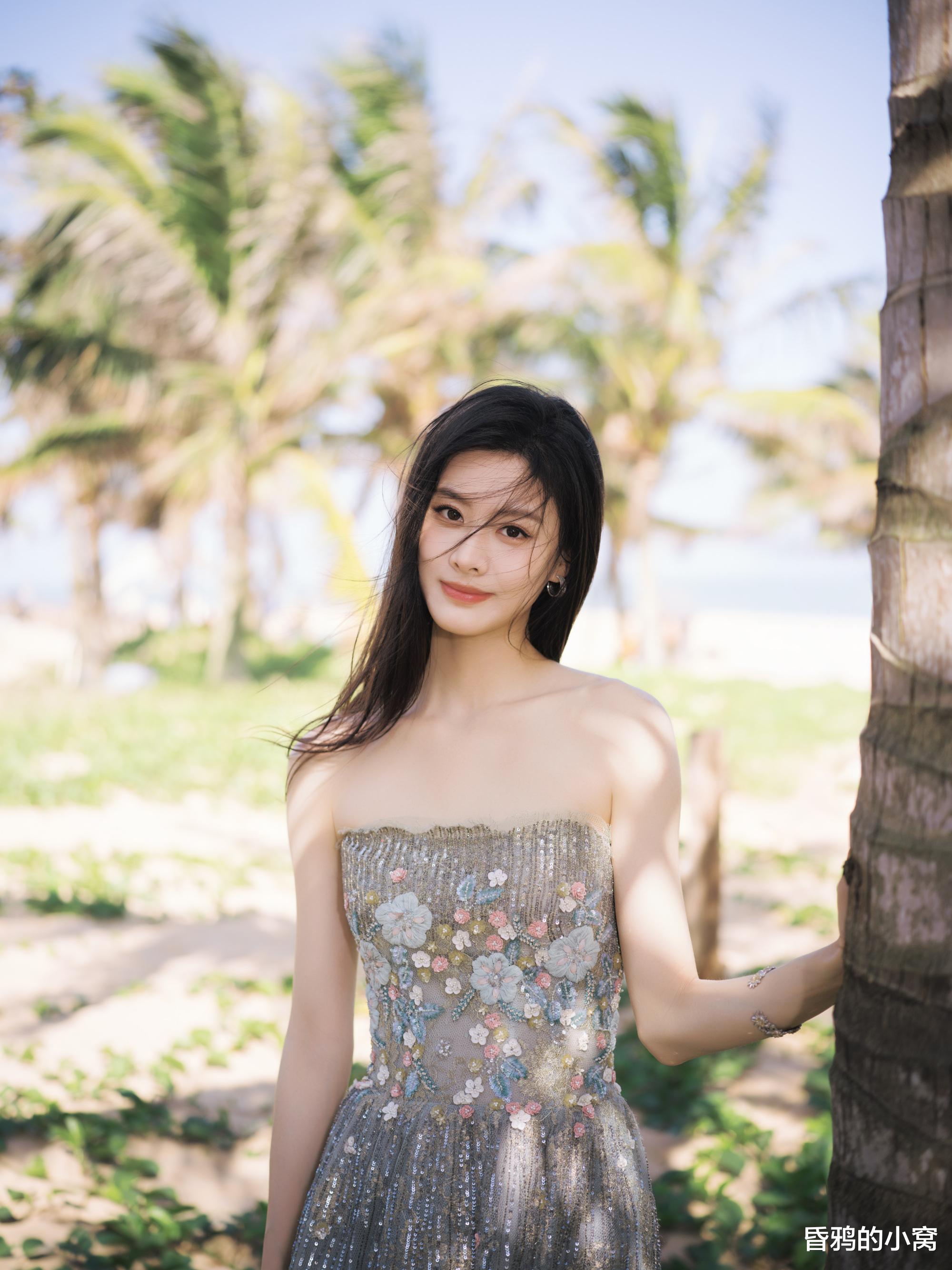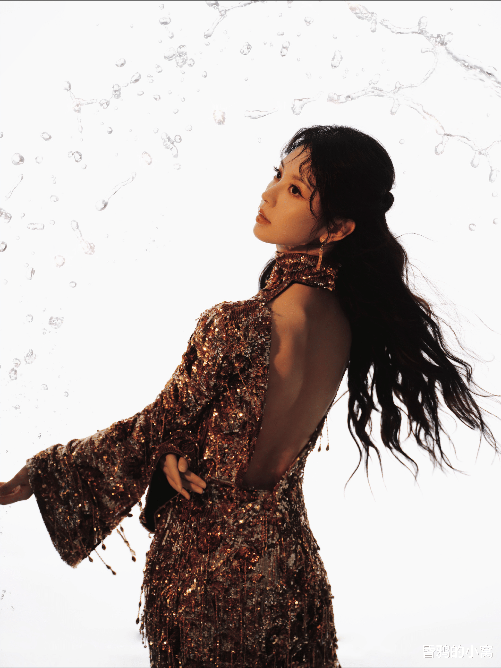 白鹿身穿波点亮片抹胸裙,细碎的银白在黑底上溅开,像浪尖抖落的星子,又像揉碎的月光落了满身。抹胸处的黑色褶皱是恰到好处的柔,裹着肩颈的线条,高开叉裙摆随着站姿轻垂,长发被风掠起几缕,冷艳里掺着漫不经心的松弛,揉成了独一份的张力。