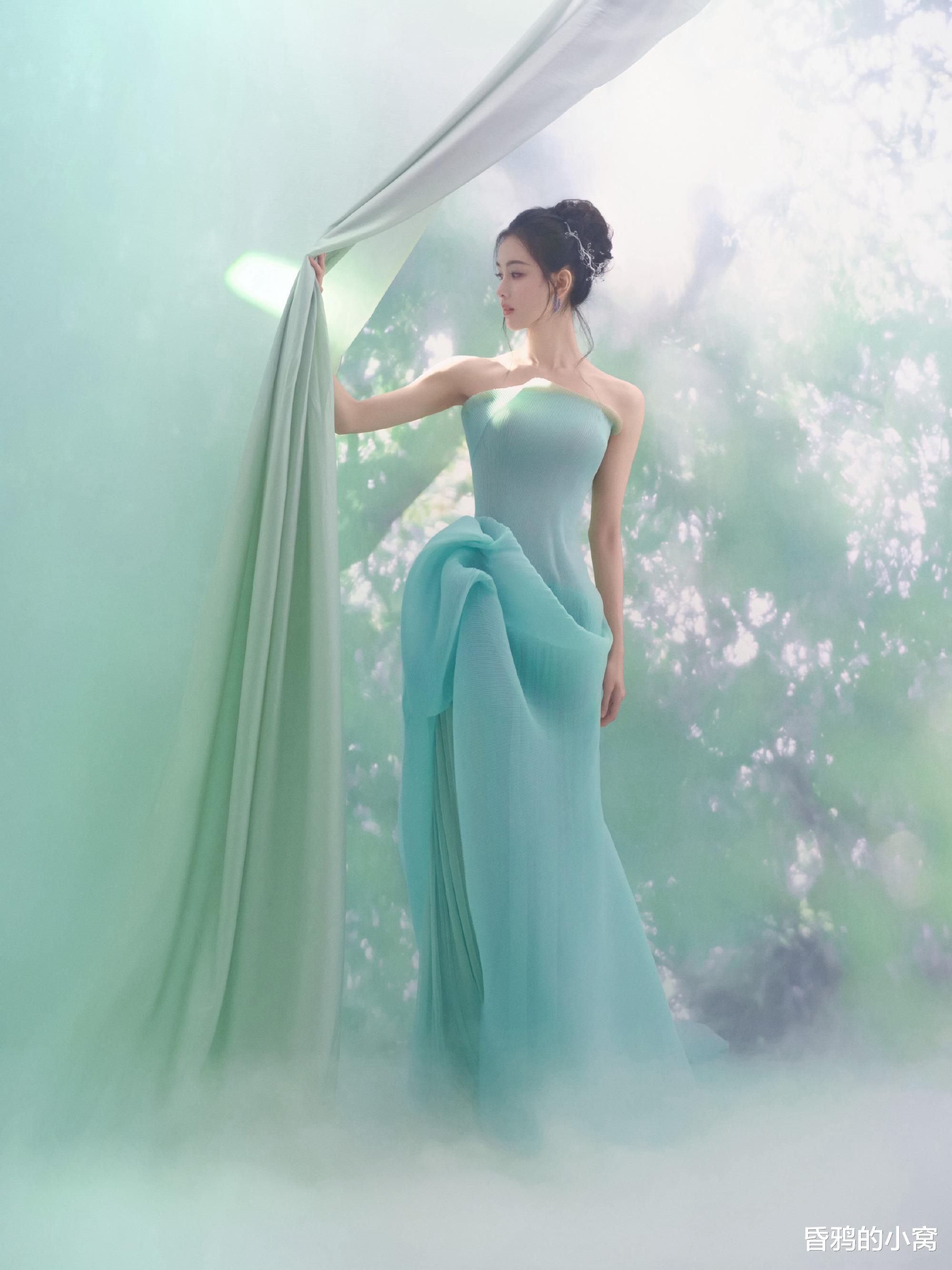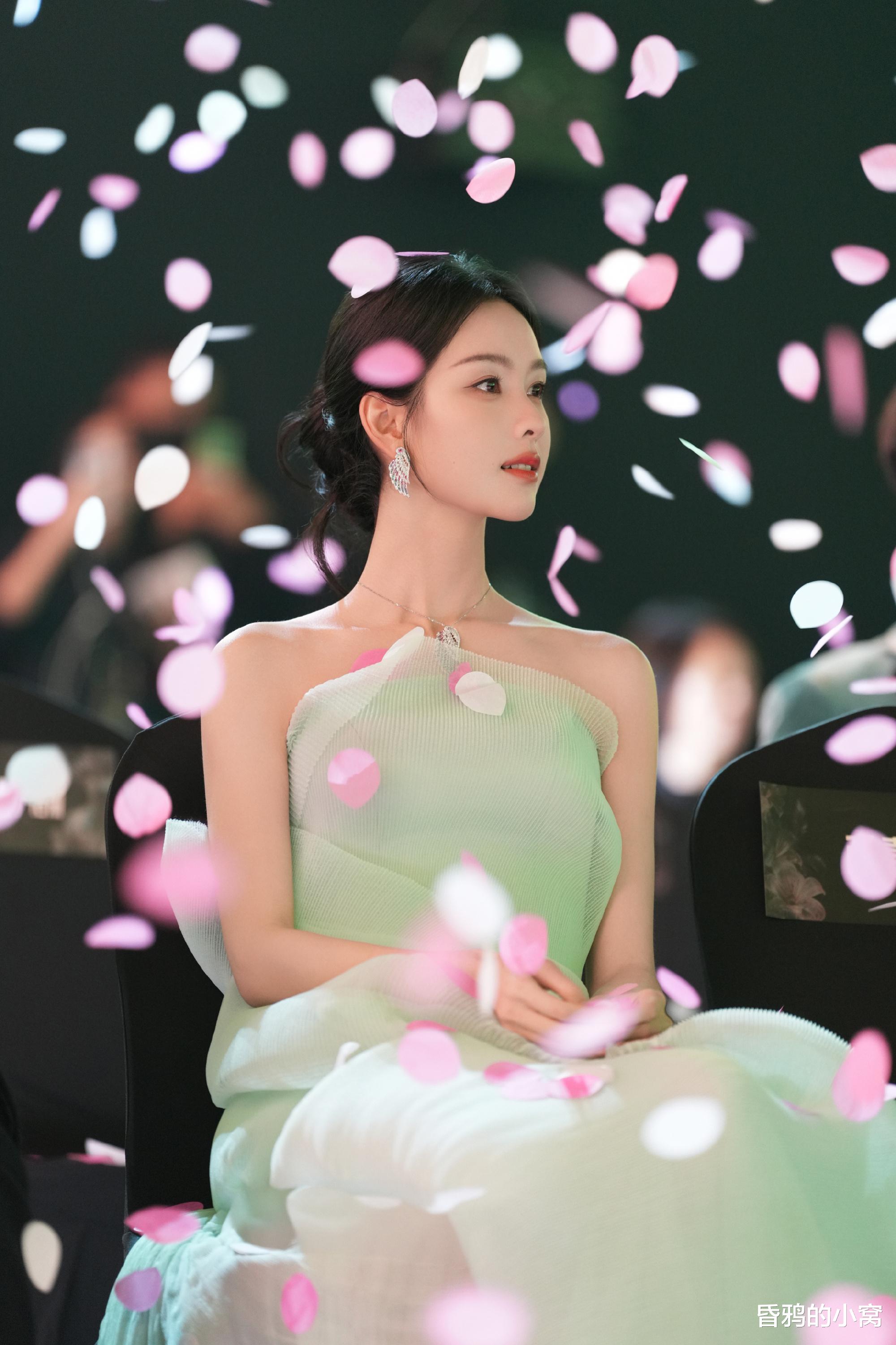 内场一袭浅薄荷绿抹胸礼服出镜,纱质面料带着细密的肌理褶皱,既衬出肩颈线条的清瘦舒展,又让裙摆如被风轻揉的荷叶般漾开柔缓弧度,整个人像浸在江南水墨里的意象,清冷气质裹着淡柔的仙气,恰好落在 “荷风送香气” 的朦胧氛围感里。