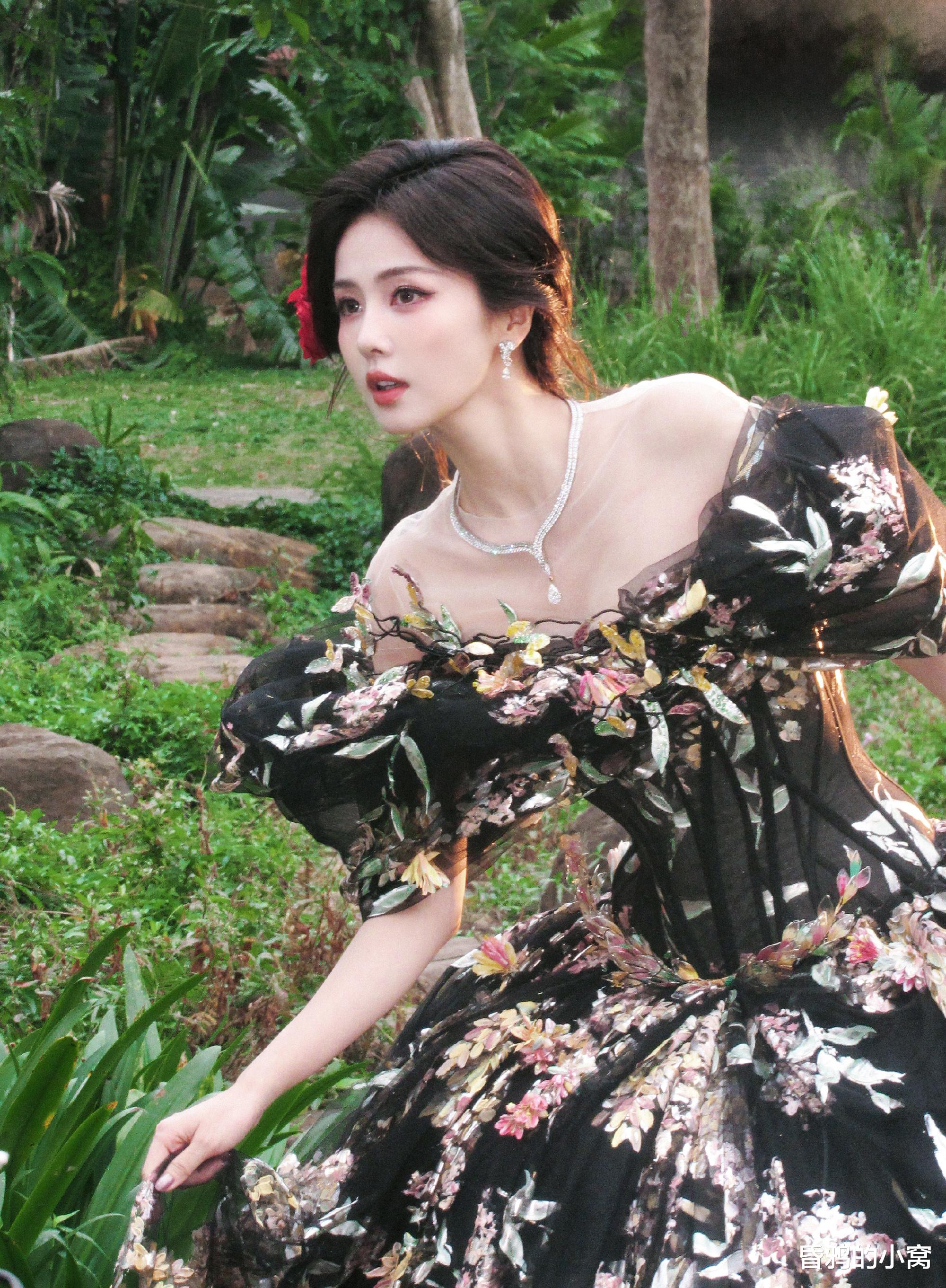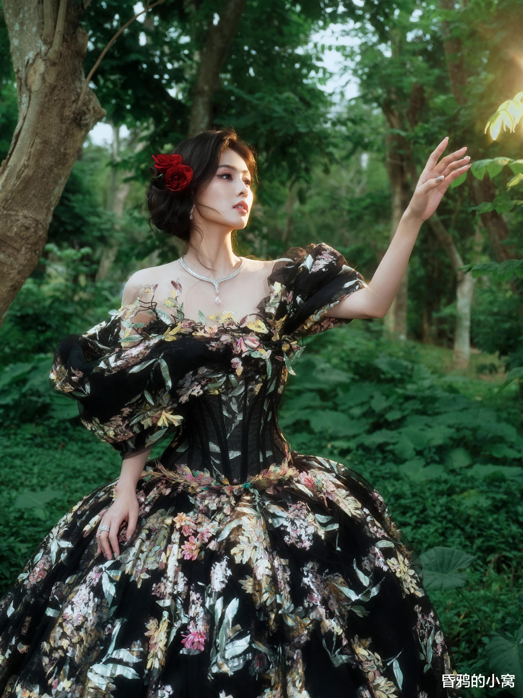 第二套绿意刺绣长裙,裙摆与泡泡袖上缀满深浅交织的花与叶刺绣,鬓边那朵艳红玫瑰是最跳脱的一笔,衬得她眼尾的弧度更柔,抬腕伸手的姿态里,既有复古礼服的优雅矜贵,又掺着几分林间晚风般的松弛灵动,像从旧油画里漫出来的缪斯,落在了鲜活的绿意里,营造“林间小鹿”仙气感。