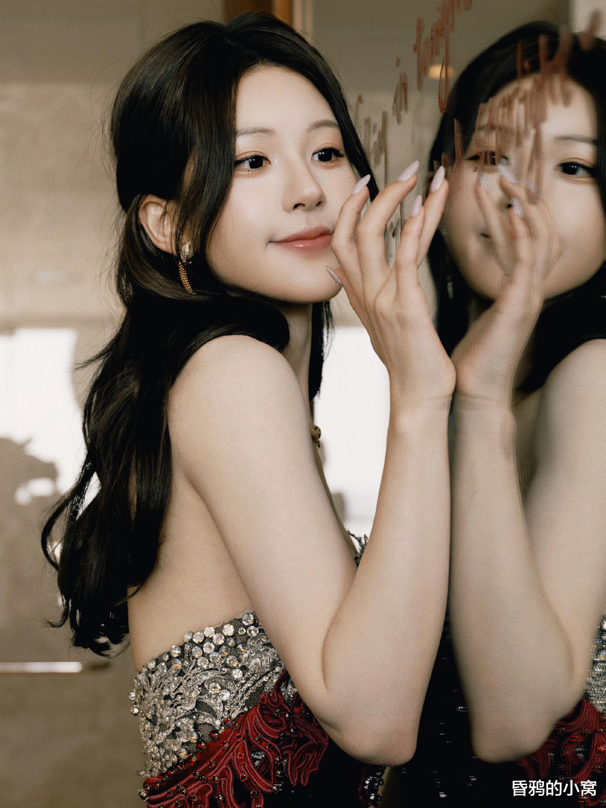 内场更换裹满银白钻饰与细密亮片的高定抹胸礼服,绒感的艳色像揉开的蔷薇,裹着肩颈的柔线条,浸着日光泛着柔闪,衬得她又娇又舒展,把甜美灵动和精致艳色揉进了松弛里。