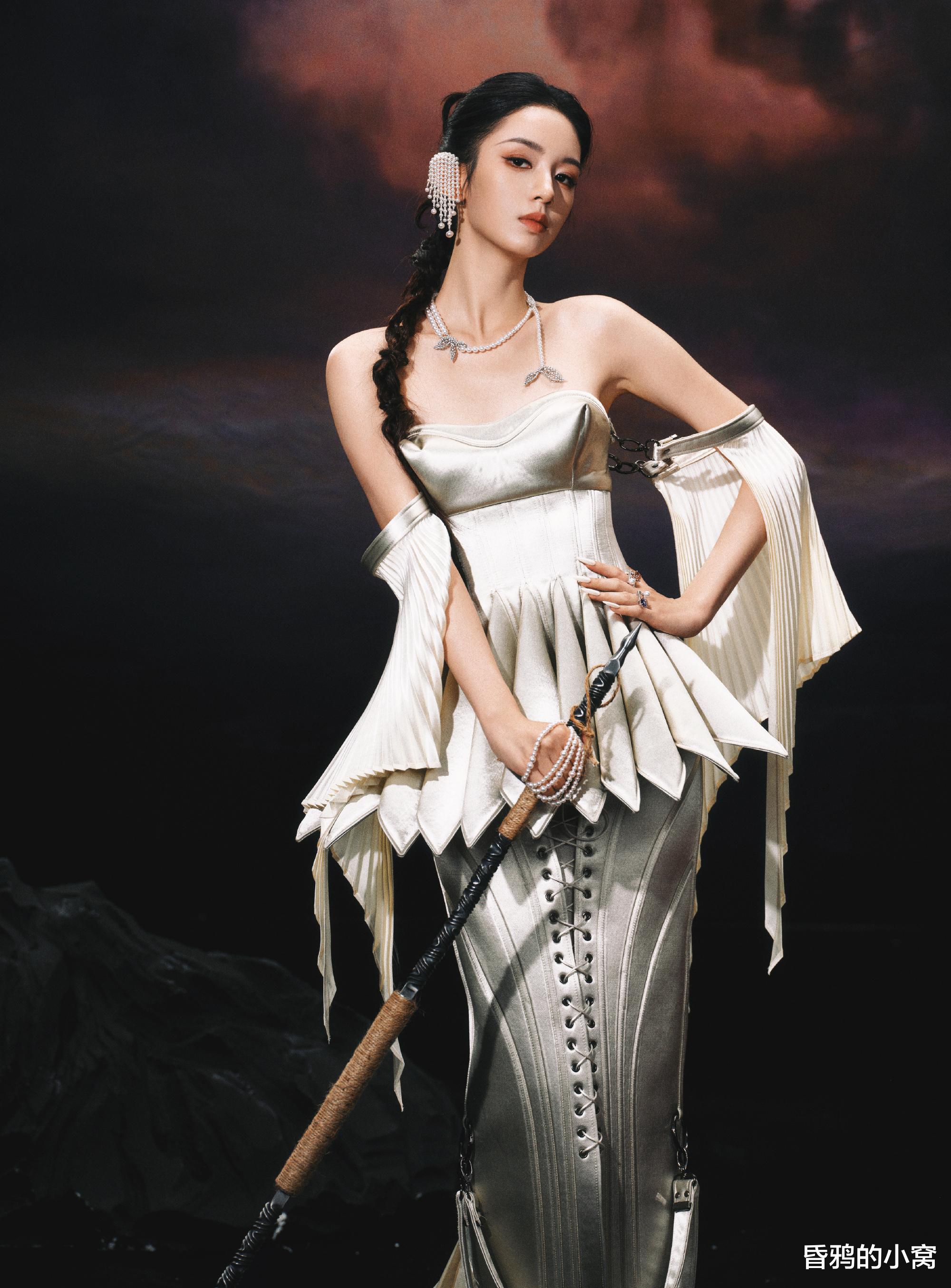 周也身穿银色铠甲披风,抹胸版型裹出纤细肩颈和复古肌理,衬得腰肢愈发窈窕,冷艳气质兼有外露锋芒,像暗夜里浸了光的鎏金雕塑,精准呼应《锦月如歌》中女将军人设。