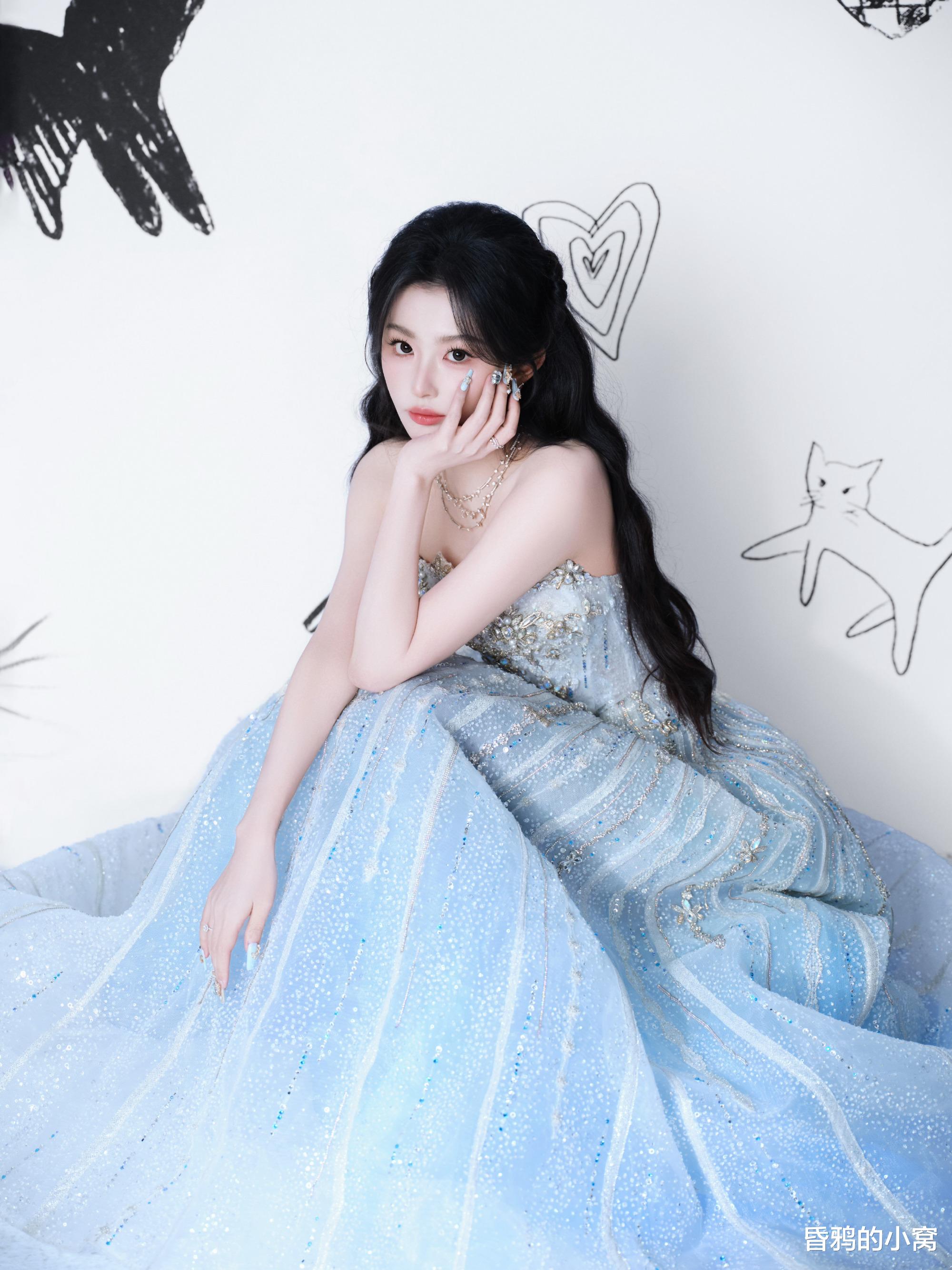 第三套压轴渐变鱼尾裙,满缀的细闪碎钻里缠着凉调的幻彩纹路,银蓝、浅粉的光泽顺着裙身曲线漫开,贴身剪裁裹出腰肢的柔弧,抹胸边缘衬得肩颈线条愈发清软,连眼妆上的细碎银辉都和裙身光泽轻轻叠在一处,把礼服的精致幻彩揉成了漫不经心的惊艳。