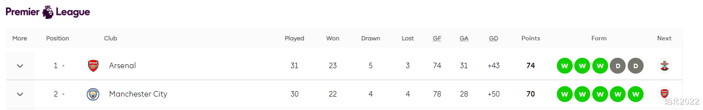 本来战利物浦、西汉姆之前,阿森纳29轮72分,多赛一场领先曼城8分。考虑到曼城还要分心欧冠和足总杯,单线作战的枪手时隔19年重夺英超冠军的可能性,从纸面上看是很大的。