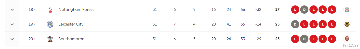本赛季的保级可以说是一场大混战。降级区的三支球队中,南安普顿31场23分的成绩,意味着他们想要翻身需要一些奇迹;莱斯特城虽然比南安普顿多2分,但他们已经连续10场比赛不胜,形势同样危在旦夕;诺丁汉森林与埃弗顿同为27分,但有着多达10个净胜球的劣势,近期同样连续10场比赛不胜。