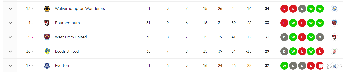 在西汉姆联身前,31场积33分的伯恩茅斯,以及31场积34分的狼队目前都获得了一定的喘息机会,只要在保级球队的相互对阵中确保拿分,基本就可以算是提前上岸。尽管如此,这两支队伍也不能掉以轻心,2012年曼联的经历已经惊醒了各队,6轮8分的优势也并不保险。