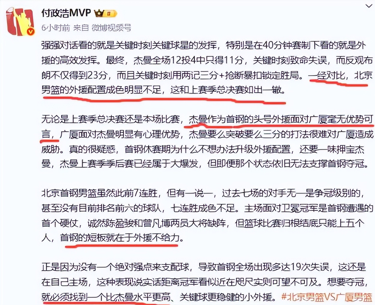许利民根本没有说到点子上,没有说到问题的实质。他表示输球原因有三点:失误太多、篮板球没抢好、重点人防守不到位。其实这并不是输球的真正原因,真正的原因很简单,那就是北京队的外援不如广厦队,外援是短板,输球就是输在这里。北京外援只拿到29分,而广厦外援拿到35分,小外援的差距更大,杰曼只得到11分,而布朗拿到23分,最后两次进攻都是布朗打中的。