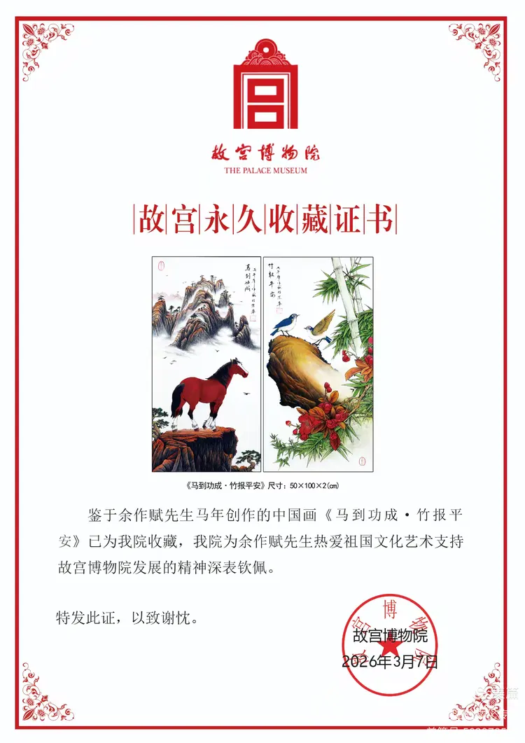 2026年3月7日,余作赋院长为马年创作的《马到功成·竹报平安》组画被北京故宫博物院永久收藏。这次的马年组画被故宫博物院永久收藏,是继龙年、蛇年组画被故宫博物院永久收藏后,再次永久收藏余作赋院长的生肖系列组画。余作赋院长自2022年虎年开始,决定为每年的生肖创作一套组画,至2033年将完成十二套生肖系列组画。这次的马年组画再次被故宫博物院永久收藏,意味着余作赋院长的生肖系列组画已经获得了故宫博物院的高度认可,其后续的生肖组画创作也必将被故宫博物院收藏!