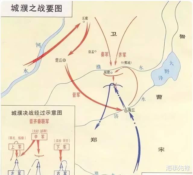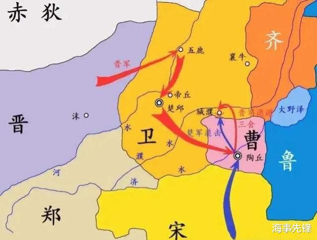 图为晋军进攻卫、曹,从而突破楚国战略封锁,得以南下争霸中原的进军路线。楚国做法像极了美国的岛链战略。