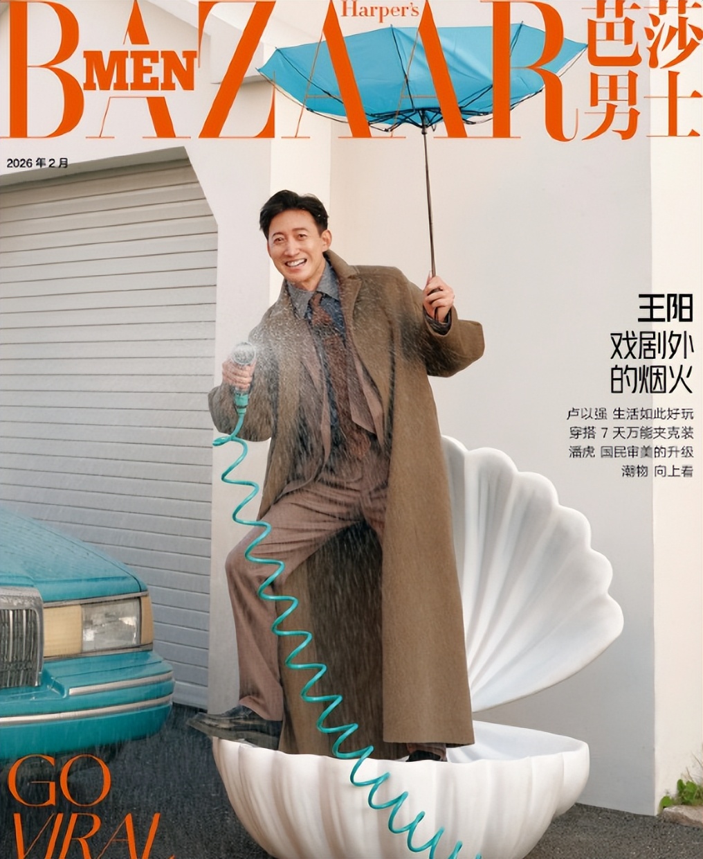 他举着破雨伞手握花洒笑容开心又放肆,最后的几套也都是潇洒中带着精致的穿搭。