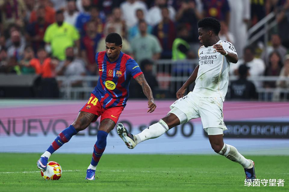 拉什福德无法像巴萨队长拉菲尼亚那样扮演好“弱侧边锋”的角色,通过不间断的前场反抢和无球跑动来策应另一侧的强侧边锋亚马尔。