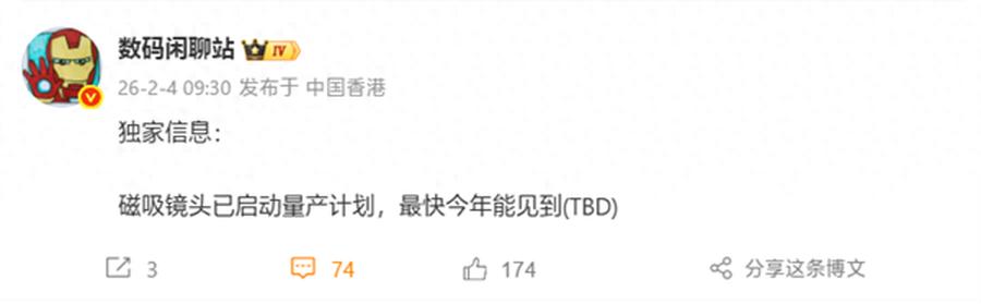 近日,博主“数码闲聊站”最新爆料称,磁吸镜头已正式启动量产计划,最快将于今年与消费者见面。尽管爆料未明确具体厂商,但结合此前行业信息推测,该磁吸镜头大概率是小米此前展示的模块光学系统——这款曾伴随小米15系列亮相的预研项目,如今距离落地又近了一步。