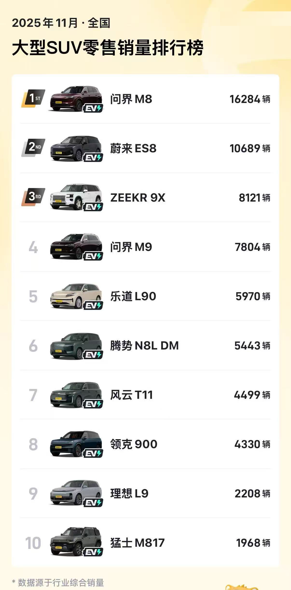 目前,这个市场的竞争核心维度已发生根本性迁移。从11月销量榜单来看,问界M8、蔚来ES8、极氪9X等位列前茅的车型,均价都在40万元以上。这标志着它们已成功突破价格天花板,彻底激活了高端新能源大三排SUV细分市场。