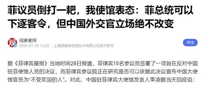 更离谱的还在后面。菲参议院内部居然炮制了一份措辞极其激进的决议草案,核心内容只有一个:要把中国驻菲使馆的部分外交官列为“不受欢迎的人”。