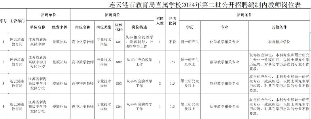 连云港市2024年直属学校招聘中,高中岗位明确将硕士研究生作为核心招聘对象,个别优质岗位甚至要求博士学位,本科生几乎无竞争优势。
