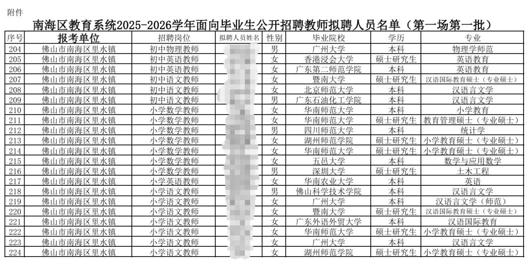 据佛山市南海区教育局公布的2025-2026学年教师招聘数据显示,中学阶段教师中,研究生学历占比远高于本科学历,且录用者几乎清一色是部属师范院校或头部高校毕业生;即便是镇级小学教师,研究生学历占比也与本科学历基本持平,其中不乏知名院校和头部高校的毕业生。