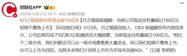 “天眼查”显示,2025年12月月之暗面5亿美元的C轮融资由阿里、腾讯、IDG资本投资;2月份新一轮超7亿美元的C+轮融资由阿里、腾讯、五源资本、九安医疗、高榕创投等联合领投,高榕创投等老股东继续加码,投后估值超100亿美元。