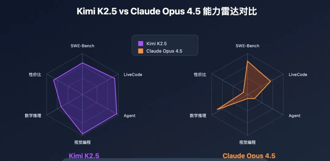 在第三方开发者社区中,有开发者对比了Kimi K2.5 和Claude Opus 4.5,后者与GPT-4o、Gemini 1.5 Pro并列为全球大模型的第一梯队,开发者选型时往往以能否达到Claude Opus水平作为参考。评测显示,K2.5在数学、视觉编程、上下文窗口、网页交互等能力上都胜过后者,同时还拥有更低的价格,对中小开发团队极具吸引力。