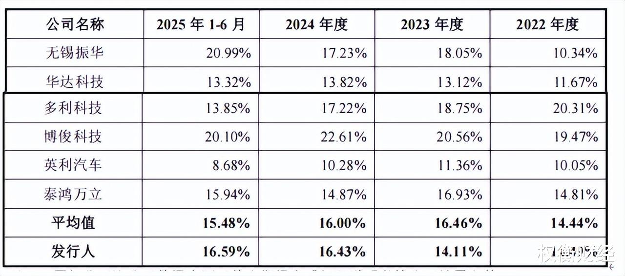 2022年-2025年1-6月,至信股份主营业务毛利率分别为14.49%、14.11%、16.43%和16.59%,同行业可比公司主营业务毛利率平均为14.44%、16.46%、16.00%和15.48%。从主营毛利率增幅看,跟净利润增幅并不匹配。