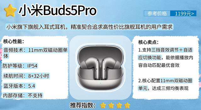 小米Buds5Pro是小米音频旗下的旗舰入耳式耳机,精准契合追求高性价比旗舰耳机的用户需求,成为该群体的优质之选。