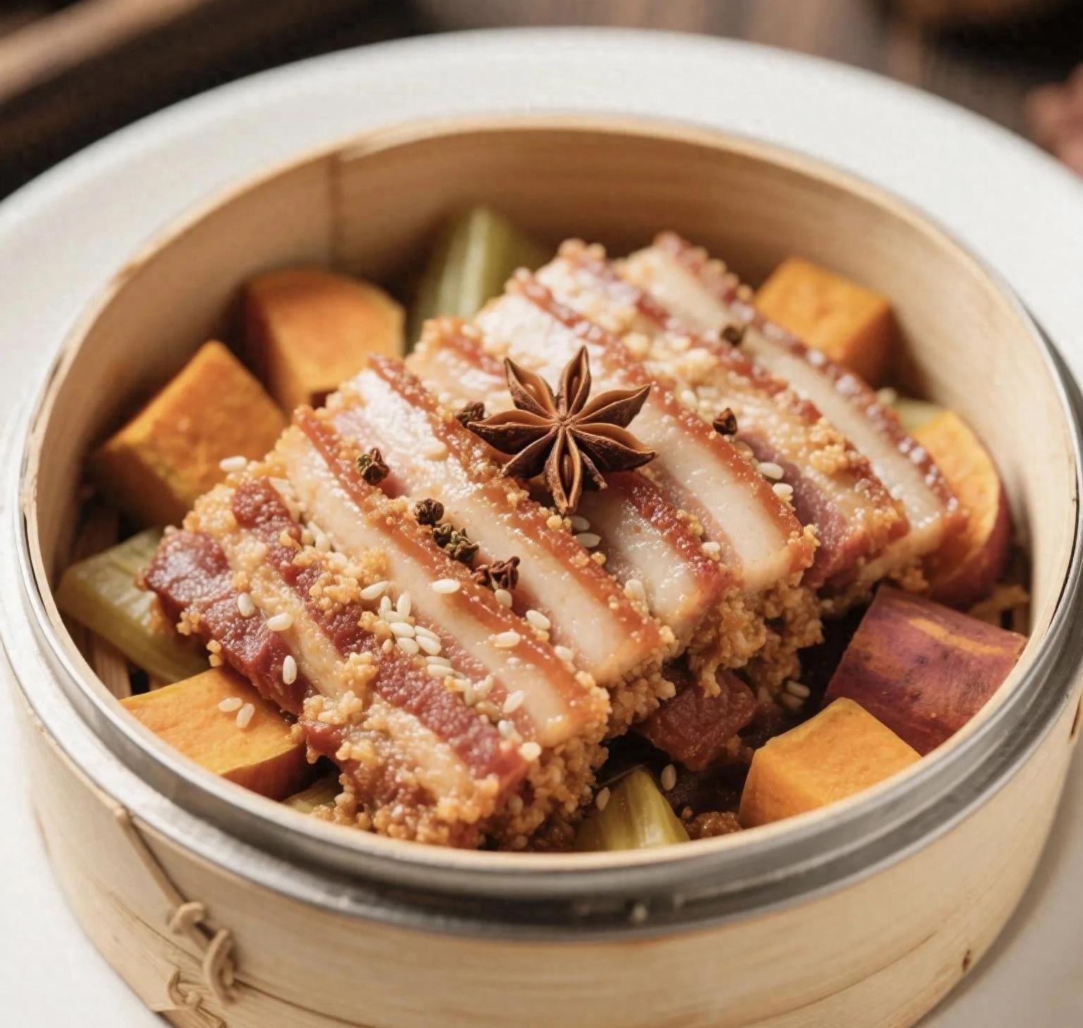 五花肉切薄片,裹上五香米粉,与南瓜、红薯一起蒸制,肉汁融入米粉,滋味瞬间提升。