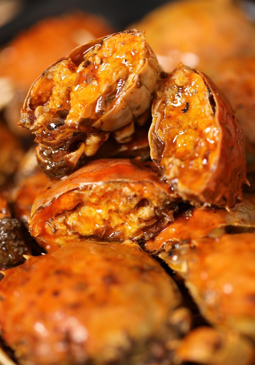 大闸蟹对半剁开,与面条一同炒制,酱汁浸透面条,鲜香四溢。