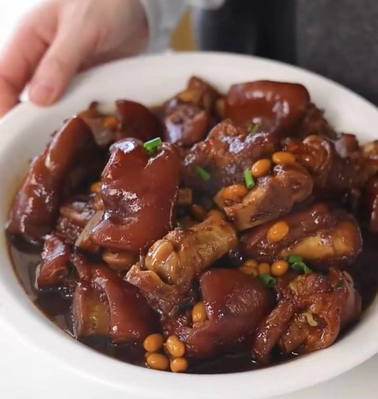 - 大火收汁,让汤汁变得浓稠一些,使猪脚和黄豆更好地裹上酱汁,然后关火,盛出装盘。