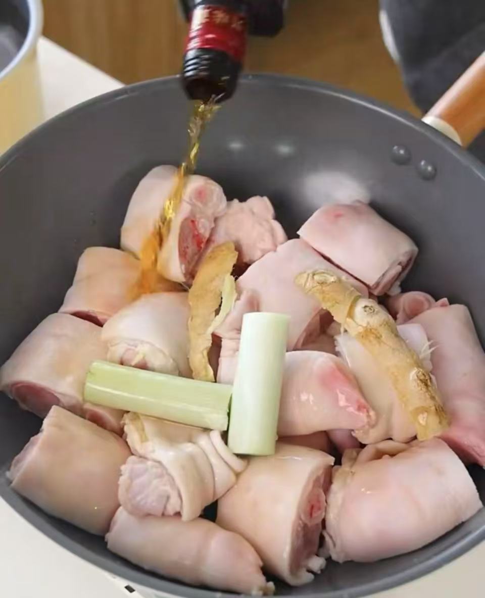 - 倒入足量清水,水面高于猪脚 3 - 4 厘米,大火烧开后盖上锅盖,转小火焖煮 1 小时。