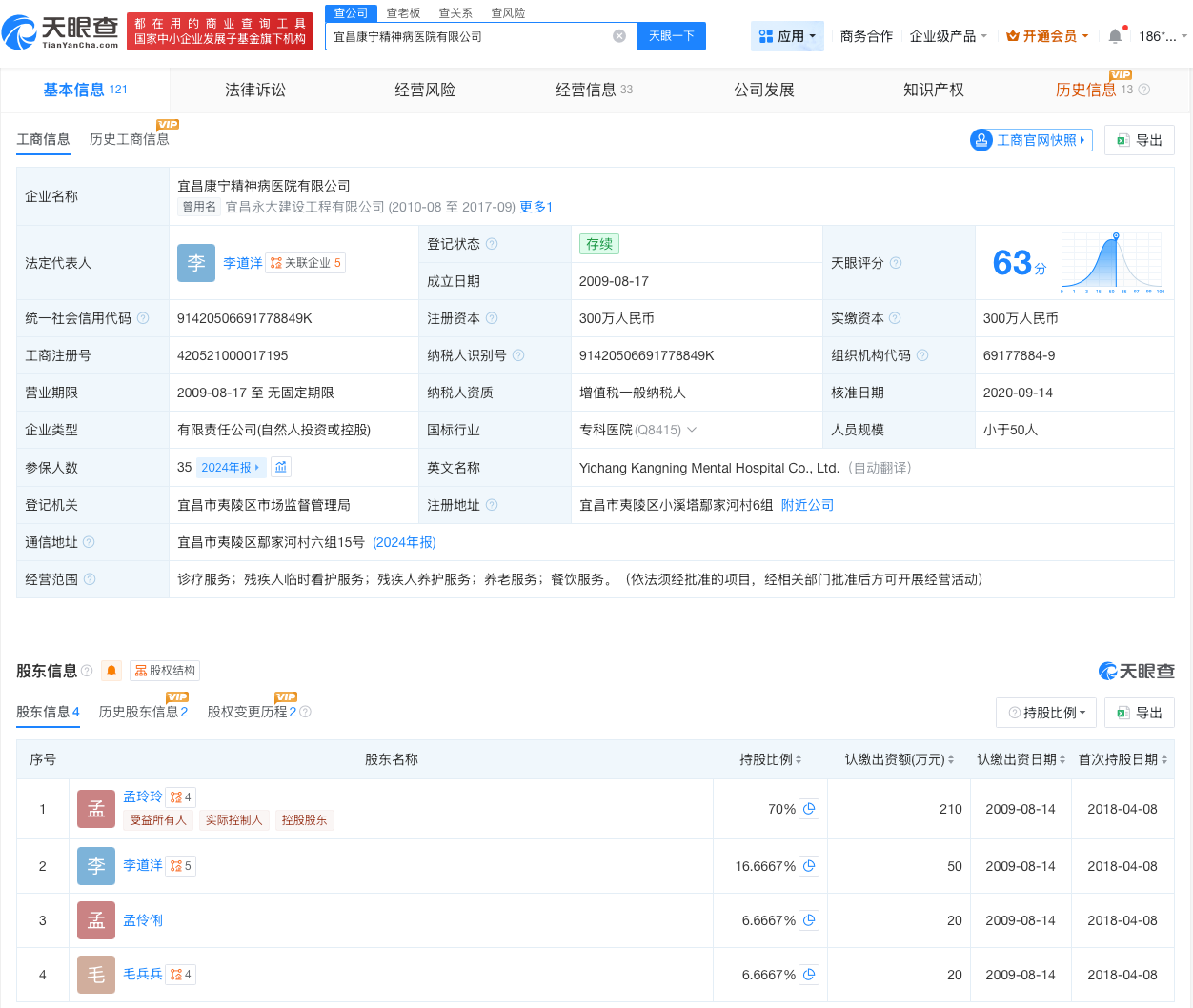 宜昌康宁精神病医院有限公司成立于2009年8月,法定代表人为李道洋,注册资本300万人民币,经营范围为诊疗服务、残疾人临时看护服务、残疾人养护服务、养老服务、餐饮服务。股东信息显示,该公司由孟玲玲、李道洋等共同持股。值得注意的是,此前该公司企业名称为宜昌永大建设工程有限公司。