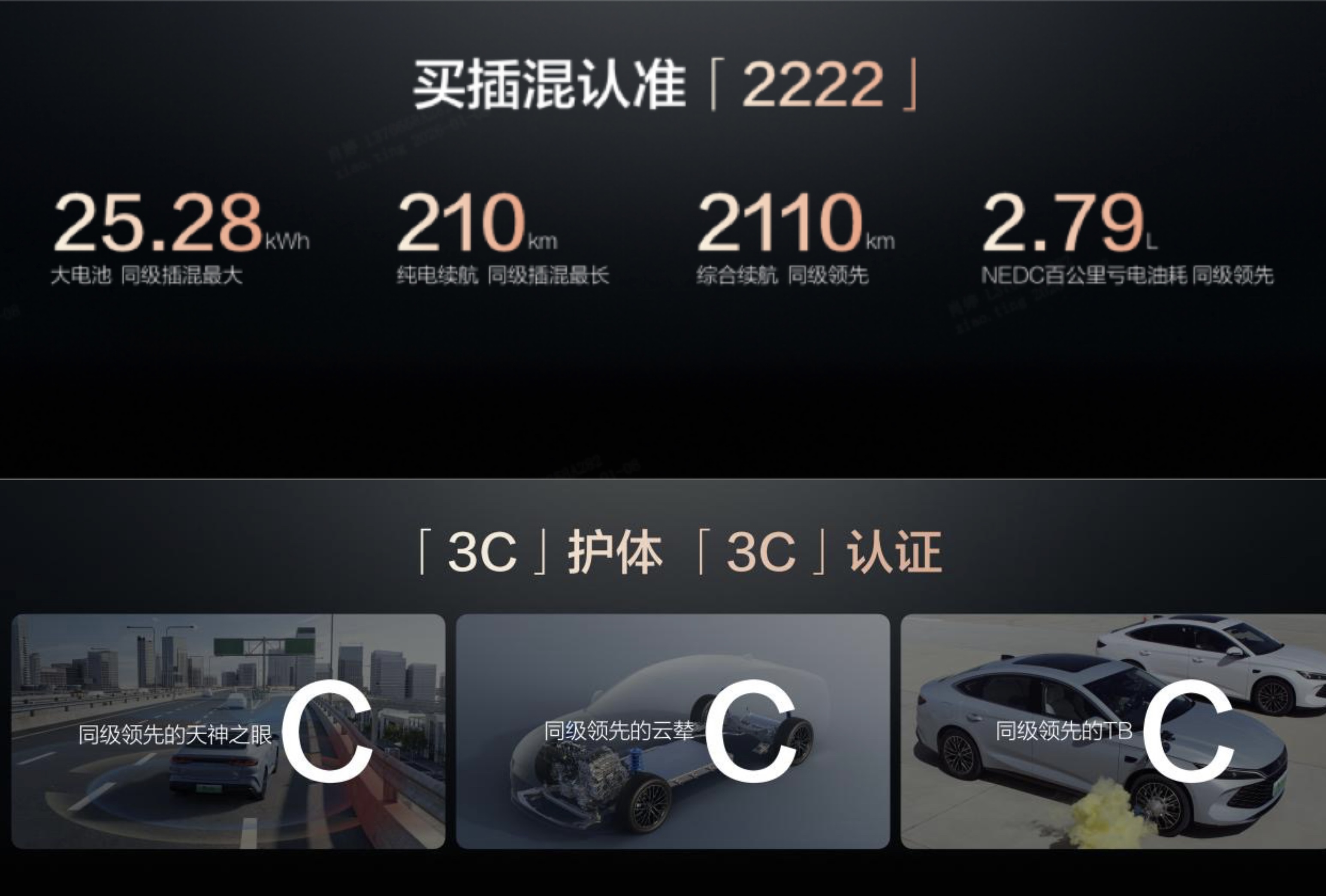 以后买插混车必须得认准“2222”了。2026款秦L DM-i和秦PLUS DM-i长续航版,均配备了25.28kW·h大容量电池,纯电续航210km,新车满油满电综合续航2110km,NEDC百公里亏电油耗2.79L,每公里成本2毛钱。