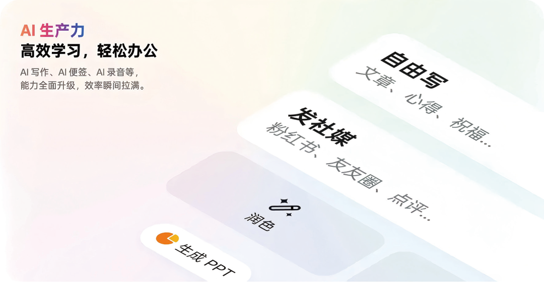 AI生产力:AI录音摘要功能不仅支持实时分角色转写,还能进行AI摘要;全新的AI写作融合了AI便签助手、文档助手和AI帮写,能提供润色、排版以及生成社媒文案等能力。